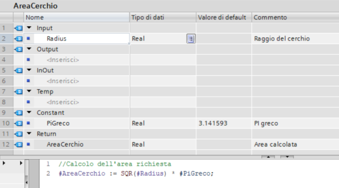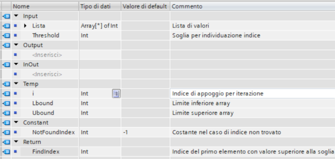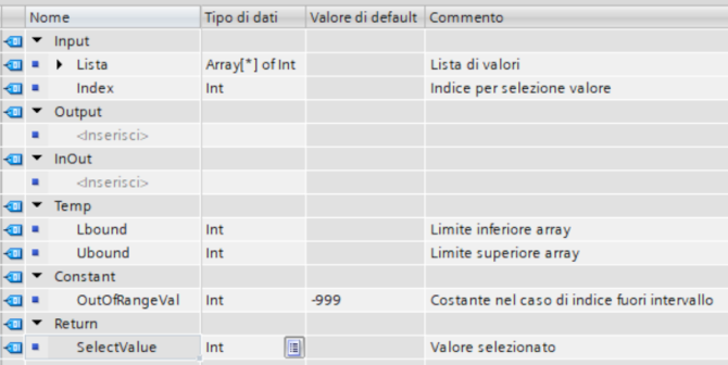 - Return: valore restituito al blocco chiamante, è paragonabile ad un parametro Output, ma può risultare comodo con il linguaggio SCL per scrivere espressioni matematiche o valutazioni logiche su una riga come in altri linguaggi
