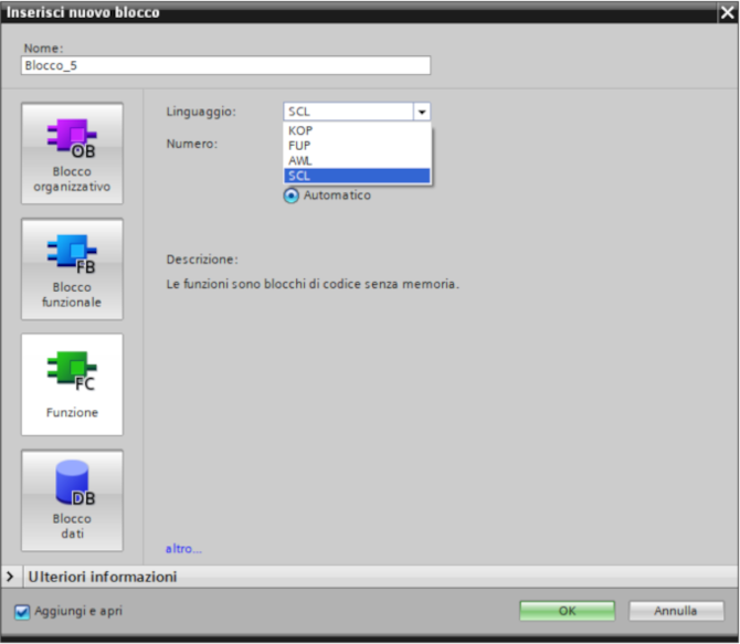 Per gli OB sono selezionabili i linguaggi KOP-FUP-SCL-AWL (quest'ultimo non con S7-1200).
