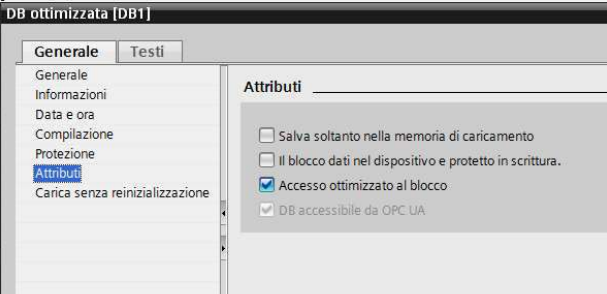 I blocchi dati per S7-1200 o S7-1500 possono avere accesso ottimizzato o standard (quelli per S7-300 o S7-400 solo standard), l'impostazione è modificabile nelle Proprietà->Attributi del blocco e di default l'accesso ottimizzato è attivo:
