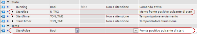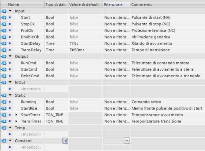 - Temp: definizione di variabili locali temporanee, permettono il salvataggio di risultati intermedi, prima di utilizzare questi parametri è buona norma inizializzarli (a seconda del tipo di accesso e del tipo di dato potrebbero assumere dei valori casuali all'entrata nel blocco)