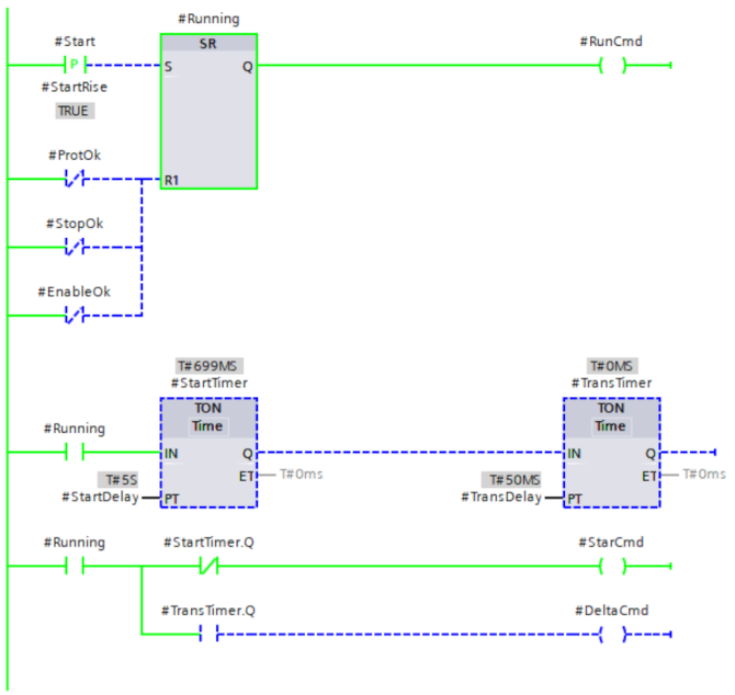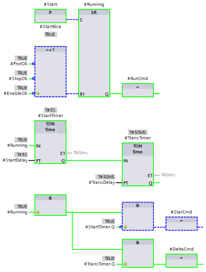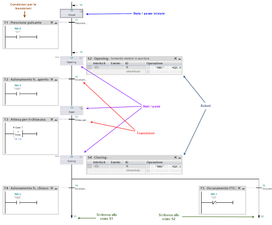 In questo caso semplice le azioni sono gestite interamente nel blocco, ma nella pratica vengono gestite con la necessaria flessibilità in FC e FB esterni: le azioni del diagramma si occupano di pubblicare su delle variabili booleane globali qual è lo stato attivo <nome-stato>.X.