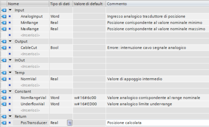 In questo caso utilizziamo un FC, non ci serve memoria statica, in Input prevediamo di passare il valore analogico di ingresso, assieme alle posizioni minima/massima corrispondenti ai valori nominali, mentre come ritorno della funzione il valore di posizione calcolato.