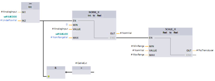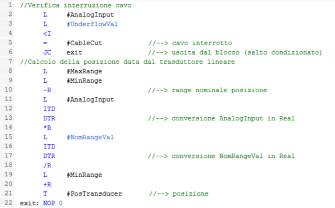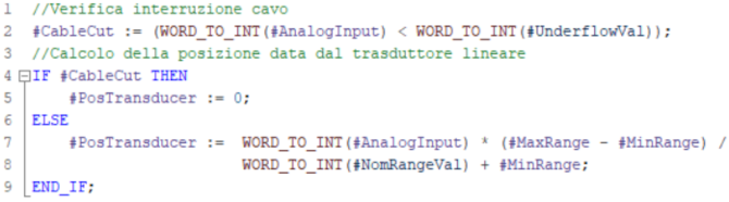In questo esercizio ho utilizzato le istruzioni NORM_X e SCALE_X concatenate, la prima restituisce in output un valore Real compreso tra 0 e 1, corrispondente al valore in ingresso rispetto al range nominale, la seconda riporta in scala il valore rispetto alle posizioni limite, se il valore analogico è inferiore al limite under-range, la posizione non viene calcolata e si attiva il segnale #CableCut: