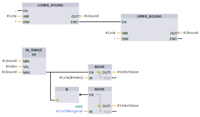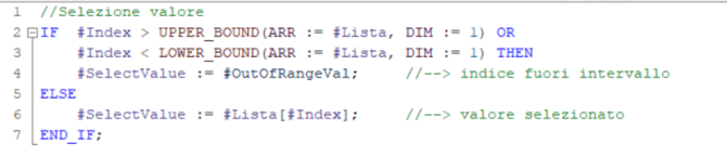 Per questo compito immaginiamo di dover selezionare da un array di valori di tipo INT, quello corrispondente ad un indice che viene passato come parametro di ingresso, anche in questo caso useremo un FC in quanto non serve memoria statica.