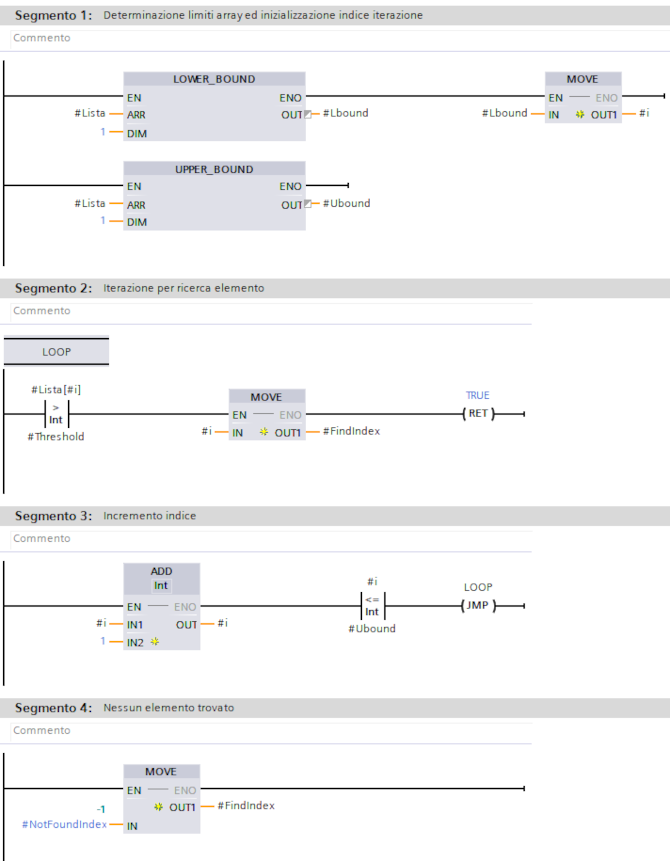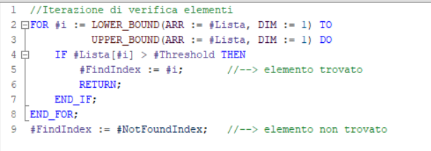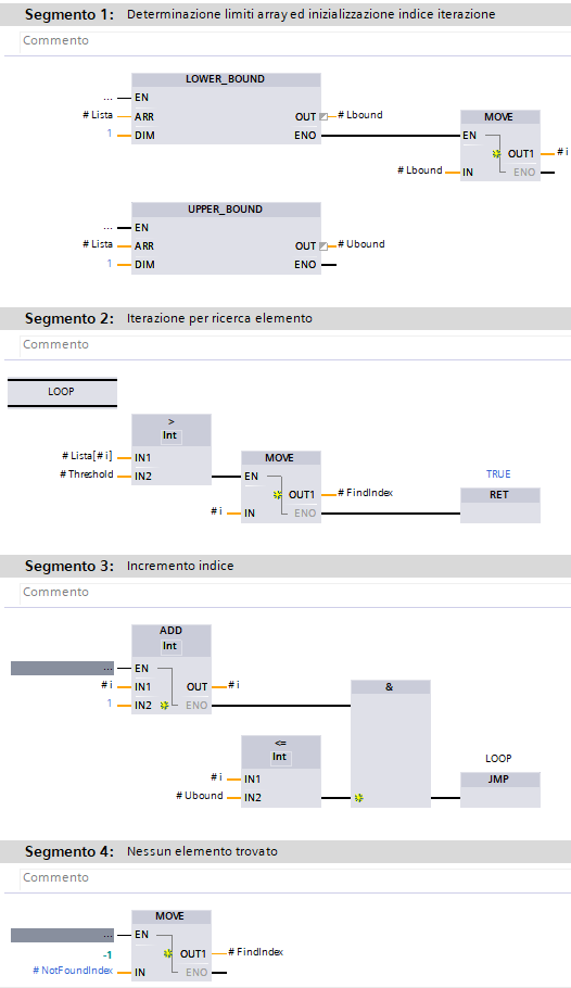la prima operazione è quella di individuare i limiti dell'array ed inizializzare l'indice di appoggio, di seguito si effettua la verifica del superamento della soglia per ogni elemento fino al primo che soddisfa la condizione, uscendo dal blocco con ENO=1.
