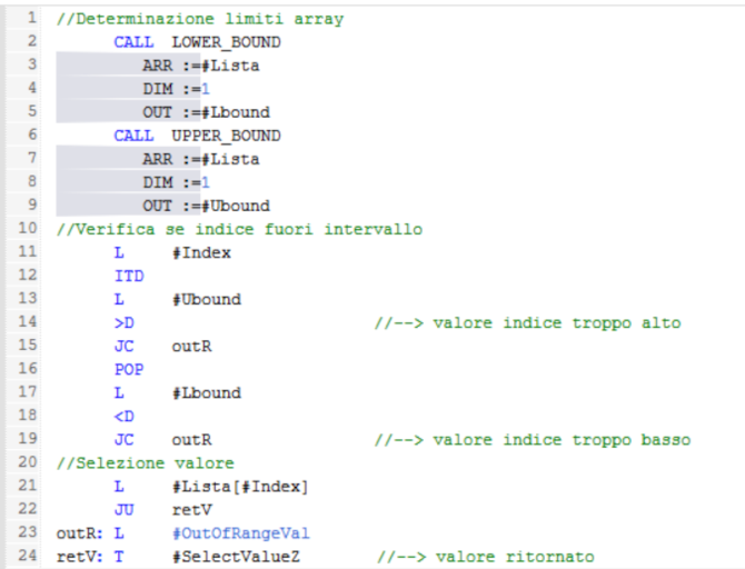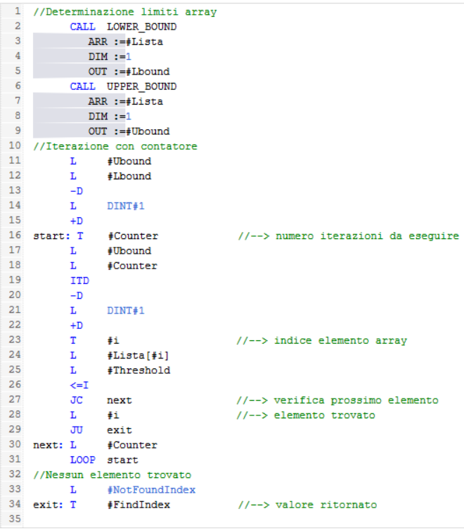 Ecco l'esercizio svolto in AWL, anche qui abbiamo innanzitutto determinato i limiti inferiore e superiore dell'array ed abbiamo dovuto usare i salti (condizionati JC ed incondizionati JU):