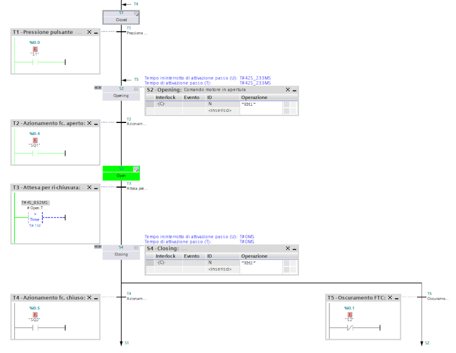 se osserviamo la transizione T3, viene verificata la variabile <nome-stato>.T, ovvero il tempo di attivazione dello stato S3 (aperto) per eseguire l'attesa prima della chiusura automatica, mentre le azioni che ho usato sono di tipo "N" (normal not stored), ovvero eseguite continuamente finché lo stato è attivo, quindi non serve verificare il raggiungimento della posizione: quando cambia lo stato le azioni di comando del motore si resettano.
