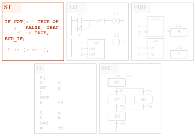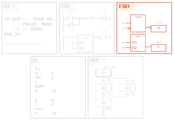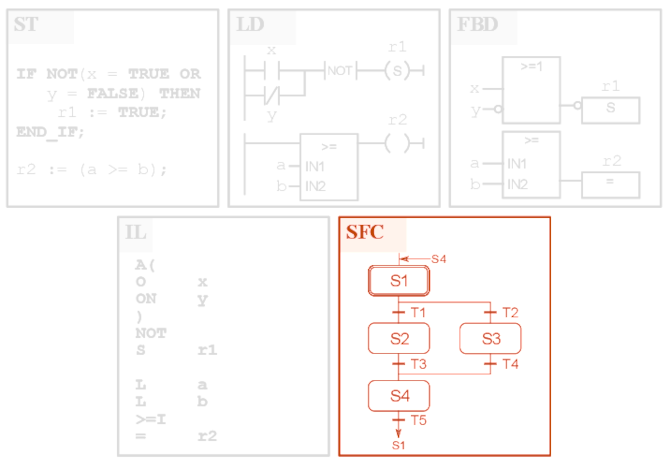 A questi si aggiunge il diagramma funzionale sequenziale - SFC (Sequential Function Chart), derivato dal Grafcet e che permette di descrivere graficamente le sequenze di un sistema di automazione.