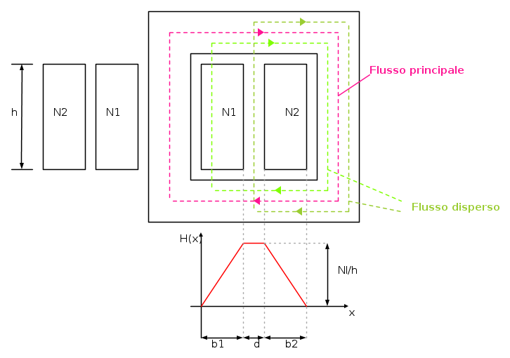 - L'aver considerato l'altezza del volume di integrazione pari all'altezza dell'avvolgimento comporta il trascurare tutta l'energia magnetica nel tratto compreso tra l'avvolgimento e il giogo. D'altra parte, usare l'altezza delle colonne del nucleo, avrebbe voluto dire considerare uniforme il campo in una regione in cui questo non lo è. La soluzione migliore potrebbe essere considerare un'altezza h media fra l'altezza dell'avvolgimento e la distanza fra i gioghi.