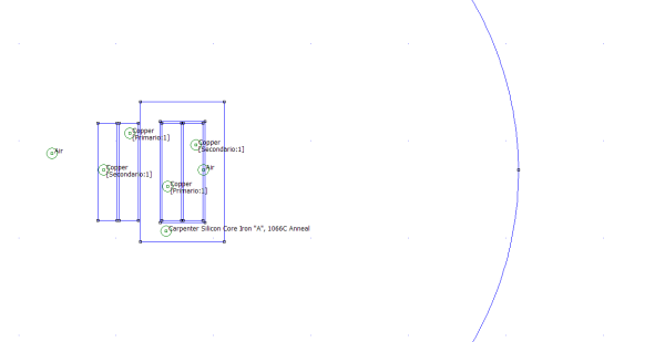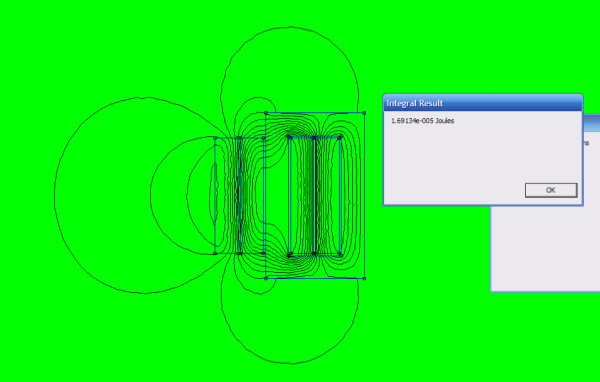 Sfruttando gli strumenti di calcolo, possiamo ora calcolare l'energia magnetica. (Nota: le linee di flusso che percorro l'intero nucleo concatenando i due avvolgimenti, contribuiscono al flusso principale e concatenano una forza magneto-motrice complessivamente nulla: non danno contributi all'integrale. Difatti, grazie alle ipotesi fatte, queste linee non vengono considerate nel calcolo classico. Con la simulazione fem non occorre più tale distinzione).