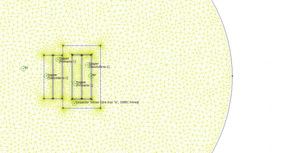 Una volta eseguite le operazioni preliminari, si "mesha" la regione da simulare, ovvero si divide lo spazio complessivo in tante piccole aree per discretizzare il problema. Femm, come quasi tutti i programmi per la simulazione di campi elettromagnetici, usa elementi triangolari a 3 nodi.