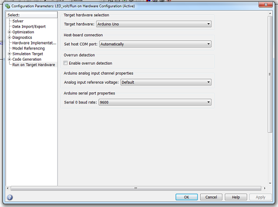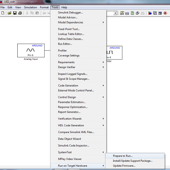 Una volta terminata la costruzione del modello in Simulink, si arriva al momento della generazione del codice. Come prima cosa occorre collegare Arduino alla porta USB del nostro computer. Non appena il device viene riconosciuto, dal menù Tools, selezioniamo Run On Target Hardware e quindi facciamo click su Prepare to Run, come mostrato in figura.