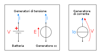 - Generatore di tensione. produce una tensione elettrica (detta fem o ddp) definita e costante (o comunque un andamento prefissato in funzione del tempo). Il variare del carico applicato comporta una variazione della corrente uscente dal generatore secondo quanto previsto dalla legge di Ohm (questa legge ritorna ne potremo mai fare a meno?)