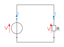 Come si può vedere sono stati collegati i due "poli" della resistenza con i due del generatore. La resistenza è stata disegnata con la sua "convenzione" per i versi di tensione e corrente e lo stesso il generatore.
