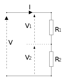 sia V la tensione che alimenta la serie e sia I la corrente che le attraversa.La tensione si ripartisce sulle due resistenze secondo le seguenti relazioni: