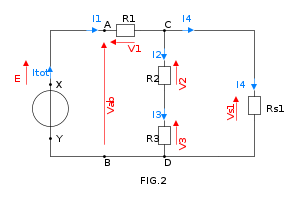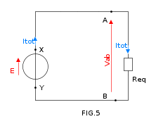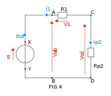Ne consegue che circola una unica corrente (chiamata Itot)e la tensione fra i punti A e B, VAB, del circuito è la stessa della fem del generatore: E.