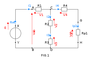 Si consideri, ad esempio, la rete elettrica seguente e si vogliano calcolare le varie correnti e le varie tensioni presenti. Come si può notare (Fig.0) è presente un solo generatore (in questo caso di tensione) e collegate in vari modi più resistenze.