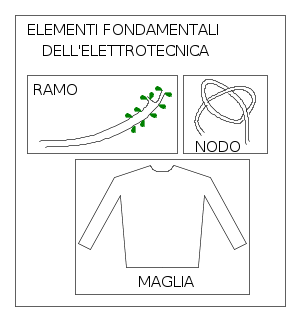 Escludendo che dal punto di vista elettrico una maglia sia un indumento, si uò chiamare maglia (elettrica) un percorso chiuso costituito dalla concatenazione di più rami, utilizzati ciascuno una volta sola nell'ambito del percorso stesso; dove per ramo si intende un pezzo di legno attaccato all'albero dal quale spuntano foglie... No eh?... Un ramo (elettrico) è un pezzo di circuito o di rete elettrica contenente elementi passivi (resistenze) e/o elementi attivi (generatori) e ai capi del quale si può misurare una ddp e nel quale circola una corrente. Più rami interconnessi che formino un circuito chiuso formano quindi una maglia.