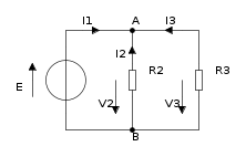 Non è possibile? è perchè? per caso è violata la convenzione dei generatori o quella degli utilizzatori? NO? Allora non c'è nulla che non va. pertanto si ha un caso in cui nel nodo A tutte le correnti entrano e nel nodo B tutte le correnti escono. Allora il nodo è un serbatoio. Neanche questo. Infatti il signor chicr... kric... chircoff (scrivi Kirchhoff) unendo l'elettrotecnichese al matematichese enunciò: "In un nodo la somma algebrica delle correnti è nulla", considerando positive le correnti entranti e negative le uscenti o viceversa che è la stessa cosa.