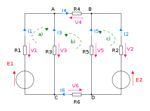 - poiché si devono ottenere m equazioni ne vanno scritte altre m-(n-1) e questo coon il secondo principio di Kircchoff ovvero con ovvero con la Legge di Kirchoff delle tensioni da applicare ad altrettante maglie fra quelle presenti nella rete ed assegnando ad ognuna uno verso di percorrenza;