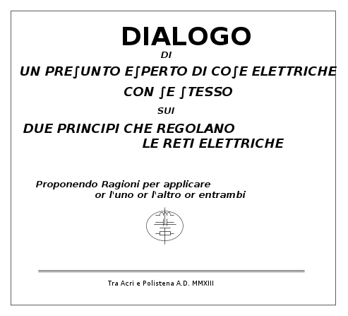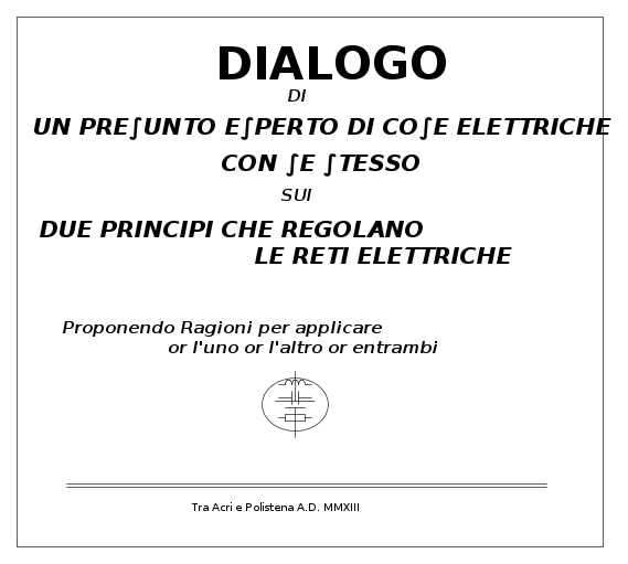 Fu la conclusione su le reti che nel NODO la summa delle correnti fosse zero e che, stessa istrana sorte ebbe a toccar a le tensioni in un percorso comunque chiuso su se istesso che mi spinse a trovar qualcheduno con lo qual disquisire sulle applicazioni di tali assai insoliti et istrani fenomeni. Non avendo però a trovar alcheduno di si fatta pazienza tal dallo affrontare cotesti oscosi argumenti ebbi a risolvermi a dissertare di ciò co l'unico disposto a perder lo tempo suo in tali reagionamenti. Questo qualcheduno est me istesso medesmo allo quale avrò a porre domande, passandomi ora per dotto (AH! AH! AH! AH!) ora per sommo ignorante delle cose elettriche.