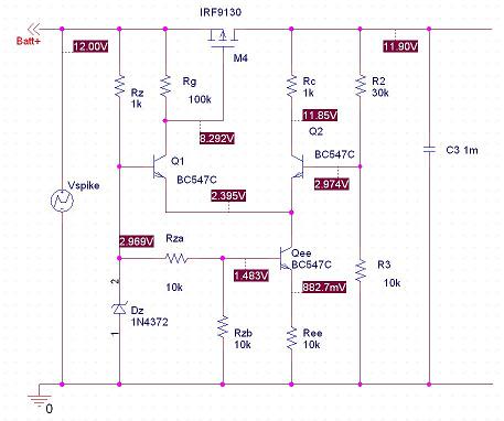 Per prima cosa, vediamo il punto di polarizzazione iniziale con un generatore da 12V all'ingresso (prendo direttamente l'immagine dal simulatore):
