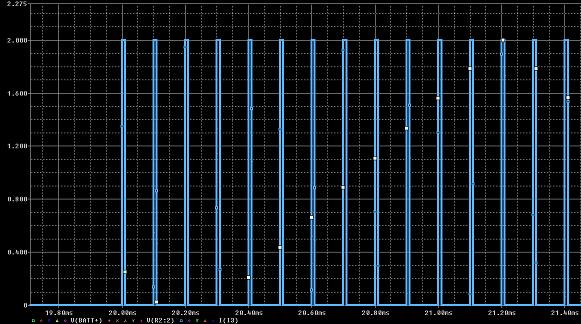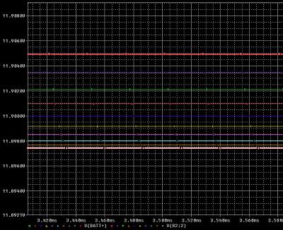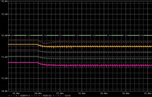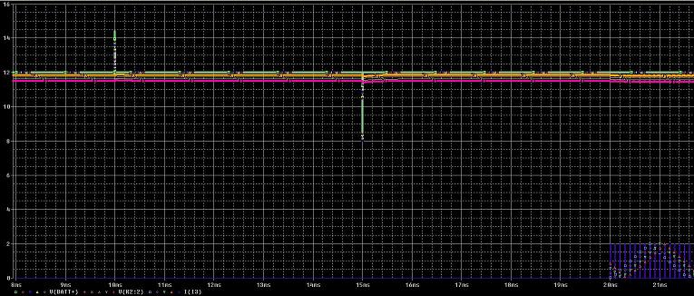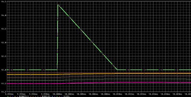 Ho poi voluto verificare la stabilità dell'uscita sia rispetto a spikes di tensione in ingresso (un tipico rumore causato dalle scintille del motore) sia rispetto a carichi cattivi ad assorbimento impulsivo. Per addensare tutto in un unico run di simulazione, ho fatto partire lo gli spikes di corrente dopo 20ms: