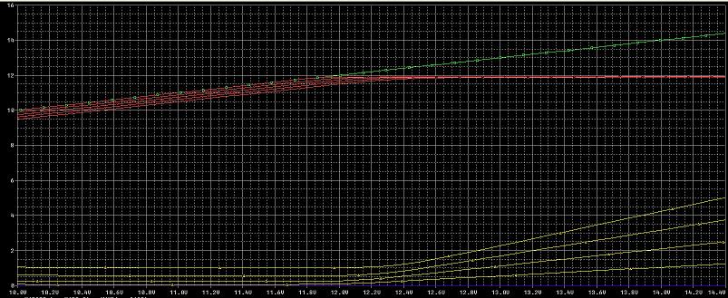 Ulteriore punto: la potenza. Il componente critico da quel punto di vista è ovviamente il MOS M1, quindi ho deciso di simulare l'andamento della potenza nel MOS con un DC sweep da 10 a 14.4V, parametrizzando la simulazione con diverse correnti di carico: