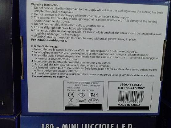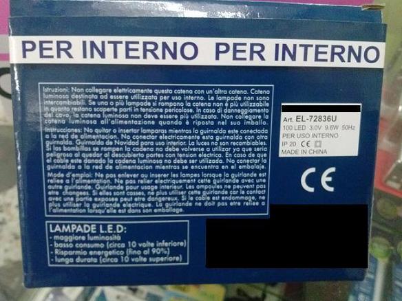 - le catene luminose, in quanto considerate componenti elettrici, sono soggette alla Direttiva di Bassa Tensione e devono riportare con apposita etichetta, in modo ben visibile, le seguenti indicazioni: marcatura CE ed eventuale marchio di qualità del costruttore; segno grafico per la classe II o III; grado di protezione IP con la dicitura “per uso interno” o “per uso esterno”; tensione nominale per le catene luminose di classe III.