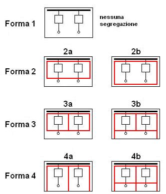 · segregazioni sono suddivisioni interne mediante diaframmi o barriere isolanti, opportunamente classificate dalla norma in sette forme (1, 2a, 2b, 3a, 3b, 4a, 4b) figura 3, che consentono di effettuare interventi su una parte del quadro mantenendo in tensione le parti adiacenti oppure realizzano un’adeguata protezione da eventuali archi interni dovuti al cedimento dell’isolante.