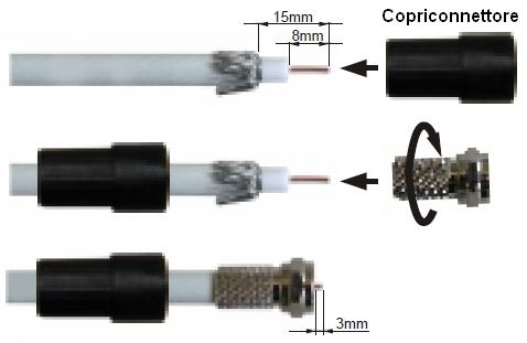 L’intestazione dei connettori è un’operazione molto delicata che va eseguita in modo accurato e preciso, la fase di “sguainatura” deve essere effettuata con attrezzi molto affilati, meglio se eseguita con appositi sguainacavi relativi al tipo di cavo impiegato vedi figura 24, evitando di incidere e schiacciare il dielettrico e di danneggiare lo schermo a nastro ma soprattutto occorre fare molta attenzione al contatto tra la treccia esterna e il corpo metallico del connettore a questo proposito una volta ripiegata sulla guaina esterna tenerla con la dita della mano e con l’altra avvitare il connettore, completata l’avvitatura tagliare la parte eccedente; una volta ultimata l’intestazione è consigliabile nastrare la parte terminale del connettore e una parte di guaina con nastro autoagglomerante ed eseguire una leggera limatura intorno alla punta del conduttore centrale per facilitarne l’inserimento nel connettore femmina, vedi figura 25;