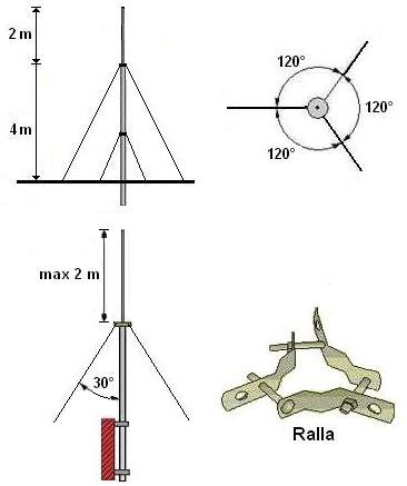 Le controventature devono essere impiegate in tutte quelle situazioni in cui non sia possibile realizzare sostegni che non forniscono sufficienti garanzie di tenuta alle sollecitazioni del vento, in pratica occorre posizionare un gruppo di controventature ogni due metri di altezza del sostegno; il gruppo di controventature deve prevedere tre stralli posti a 120° agganciati al palo con un’apposita ralla vedi figura 17.