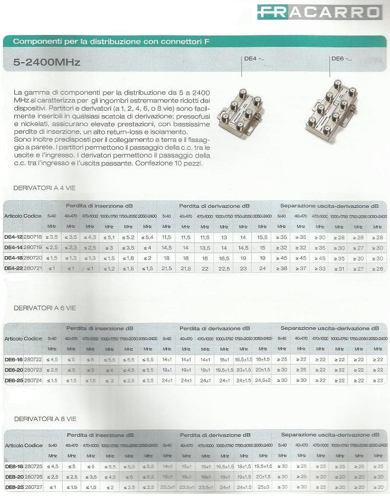 Questo tipo di componente deve avere il connettore di uscita terminato con una resistenza da 75 Ohm nel caso non fosse utilizzato. Il derivatore è il componente che deve essere utilizzato per la distribuzione del segnale alle varie prese in quanto permette una separazione dalla colonna montante in modo che qualsiasi interferenza causata da un singolo televisore non si distribuisca sull’intero impianto. Sul mercato sono disponibili derivatori fino a 8 uscite derivate e sono caratterizzati dai seguenti parametri in funzione della frequenza: perdita di inserzione o di passaggio dipendente dal numero di derivazioni e in genere non superiore a 6 dB; perdita di derivazione parametro dipendente dal catalogo del costruttore ad esempio quello FTE prevede derivatori a due vie con perdite di derivazione di 10, 12, 15, 20, 25, 30 dB; attenuazione di separazione tra uscita e derivazione in alcuni tipi può arrivare fino a 45 dB. In figura 13 e 14 sono riportate le caratteristiche tecniche dei partitori e derivatori Fracarro.