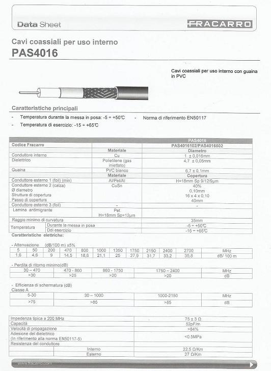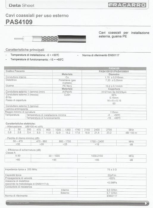 Le caratteristiche principali che devono essere analizzate per una corretta scelta del cavo coassiale sono: l’attenuazione espressa in dB per 100 metri alla temperatura di 20 °C; la classe di schermatura espressa in dB e identificata con SA (attenuazione di schermatura); la capacità corrisponde alla quantità di carica elettrica che si accumula tra il conduttore centrale e lo schermo in un metro di lunghezza viene espressa in pF al metro e deve essere la minore possibile; l’impedenza che per quanto riguarda la ricezione televisiva è stata standardizzata a 75Ω; il raggio minimo di curvatura che in genere deve essere uguale o maggiore di 5 volte il diametro esterno del cavo; nelle figure 6 e 7, come esempio, sono riportate le schede tecniche di due cavi coassiali del catalogo Fracarro, uno adatto per interni e uno per esterni.