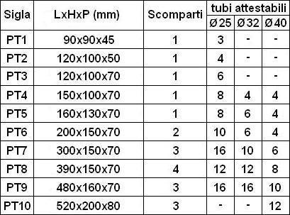 Ai fini di una corretta installazione dei vari componenti (divisori, filtri, attenuatori, derivatori), nel rispetto della curvatura massima dei cavi coassiali e al numero massimo di tubi attestabili è consigliabile installare scatole di derivazione uguali o superiori alla classificazione PT6 (tabella 1) le cui misure garantiscono un buon margine di operatività, vedi figura 23;