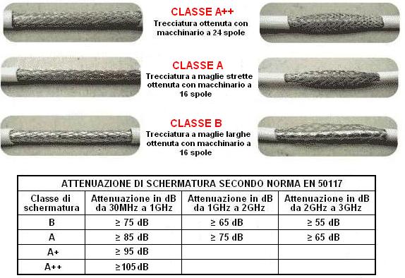 - treccia o conduttore esterno realizzata con fili di rame opportunamente intrecciati con l’ausilio di macchinari industriali che utilizzano un determinato numero di spole (16 o 24), è una seconda schermatura efficace soprattutto contro le interferenze alle basse frequenze; la norma EN 50117 per il cavo coassiale utilizzato nella banda da 30 MHz a 3 GHz ha introdotto “la classe di schermatura” identificata con il parametro SA (Screening Attenuation) espresso in dB e definito come la capacità dello schermo di impedire sia l’irradiazione verso l’esterno dei campi elettromagnetici trasportati sia a quelli esterni di disturbare il segnale all’interno del cavo, figura 5.