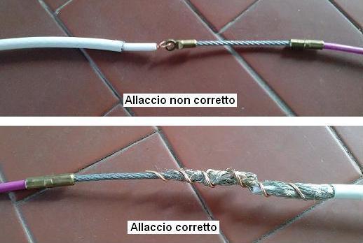 In fase di installazione di un impianto televisivo, il cavo coassiale risulta essere l’elemento più sensibile, le sue caratteristiche elettriche infatti dipendono prevalentemente dalla struttura geometrica delle varie componenti pertanto è di fondamentale importanza che non vengano alterate durante la posa e la fase di montaggio della presa mediante eccessiva trazione, piegature, schiacciamenti; in figura 21 è visibile il corretto aggancio alla sonda di trazione che deve essere ovviamente opportunamente nastrato fino a coprire la guaina esterna;