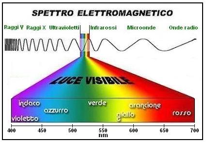 La radiazione infrarossa rappresenta una parte dello spettro elettromagnetico sino ad oggi conosciuto, la sua lunghezza d’onda è compresa tra 1 mm e 750 nm (300 GHz e 400 THz) e si colloca tra la banda della radiazione visibile e quella delle onde radio; questo tipo di radiazione si manifesta sotto forma di calore e può essere rilevata con l’impiego di un particolare strumento, il bolometro. Il termine infrarosso deriva dal latino “infra” sotto, significa sotto il rosso ed indica che la sua frequenza si trova subito sotto quella del colore rosso della luce visibile, in figura 3 è schematizzato lo spettro elettromagnetico con particolare riguardo alla luce visibile.
