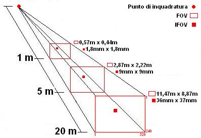 · risoluzione geometrica del sensore in genere questo parametro coincide con il numero di pixel che compongono la matrice, varia da 4x4, 16x16, 120x120, fino a 160x160, 200x150, 320x240, per arrivare ad un massimo di 680x420; ovviamente più è grande la risoluzione geometrica migliore è la capacità di rappresentare termicamente l’oggetto in esame;