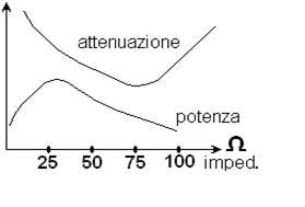 - impedenza caratteristica (impedance) dipende esclusivamente dalla costante dielettrica ξr del materiale isolante utilizzato e dal rapporto tra il diametro del conduttore interno ed il diametro interno dello schermo. Nel grafico riportato in fig.1 è rappresentata l’attenuazione del cavo in funzione dell’impedenza caratteristica; dal grafico è chiaramente visibile che il massimo valore di potenza si ottiene con una impedenza caratteristica di circa 30 Ω, mentre la minore attenuazione si ottiene con una impedenza caratteristica di circa 75 Ω. Nel caso delle trasmissioni a radio frequenza, il valore dell’impedenza caratteristica è stato normalizzato a 50 Ω, nella ricezione dei segnali televisivi invece il valore dell’impedenza caratteristica è stato normalizzato a 75 Ω. Questo perché in trasmissione il valore di 50 Ω risulta essere un equo compromesso tra attenuazione e potenza, mentre in ricezione televisiva in assenza di potenza elevata, il valore di 75 Ω è quello che garantisce la minima attenuazione;