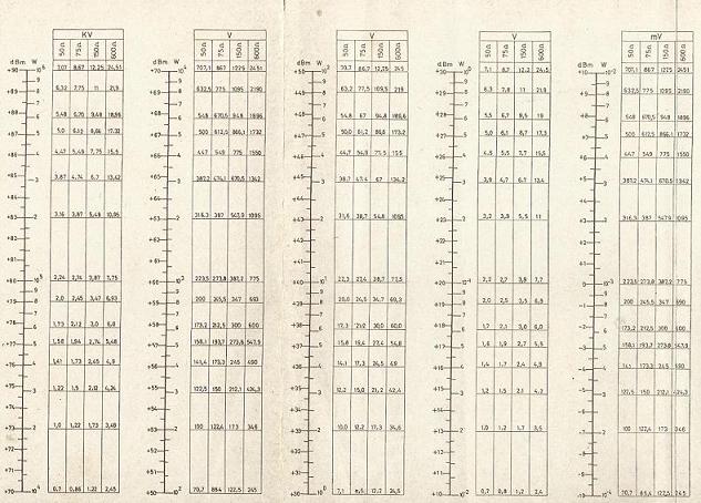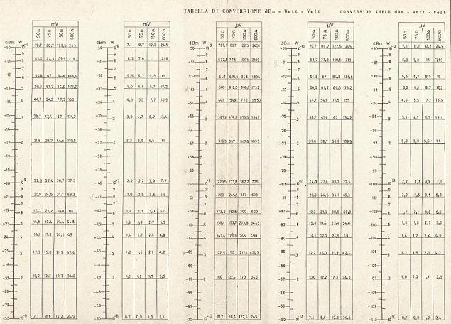 1 - rappresenta il valore della potenza di trasmissione espressa in dBm ovvero dB rispetto ad 1 mW; quindi il livello di 0dBm corrisponde ad una potenza di 1 mW e, in base alla relazione P = V2/R dove P vale 1 mW ed R vale 50 Ω, equivale ad una tensione di 223,6 mV che in dB è pari a 107 dBμV. In termini di potenza ogni 3 dB si ha un raddoppio e ogni 10 dB si ha un aumento di dieci volte ad esempio 1 W = 30 dBm, 2 W = 33 dBm, 10 W = 40 dBm, 100 W = 50 dBm, mentre in termini di tensione ogni 6 dB si ha un raddoppio e ogni 20 dB si ha un aumento di dieci volte ad esempio 0 dBμV = 1 μV, 6 dBμV = 2 μV, 20 dBμV = 10 μV, 100 dBμV = 100 mV, 107 dBμV = 223,6 mV. Nelle figure 8 e 9 sono riportati i valori di dBm e W in funzione delle varie impedenze di carico, i valori con segno negativo esprimono una potenza inferiore ad 1 mW ad esempio -3 dBm = 5•10-3 W, -10 dBm = 10-4 W, -20 dBm = 10-5 W, -50 dBm = 10-8 W;