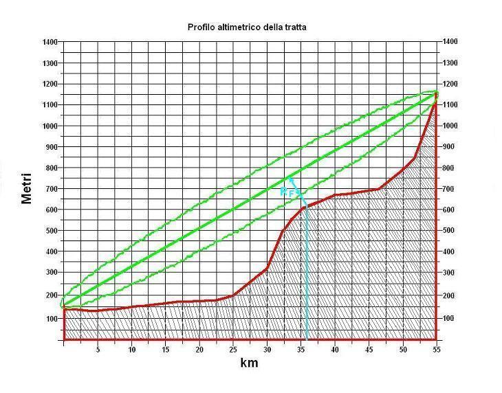 Si deve eseguire un collegamento fisso in ponte radio tra gli studi televisivi e la postazione principale di una emittente televisiva, utilizzando la frequenza di 12,95 GHz regolarmente autorizzata dal Ministero delle comunicazioni, tra due punti con visibilità ottica distanti 55 km, l’antenna trasmittente può essere installata ad una hslm di 160 m (140 m + 20 m l’altezza dell’illuminatore dal suolo) collegata al trasmettitore con un cavo in guida d’onda della lunghezza di 32 m, l’antenna ricevente può essere installata ad una hslm di 1155 m (1130 m + 25 m l’altezza dell’illuminatore dal suolo) collegata con un cavo in guida d’onda della lunghezza di 35 m. Nella tratta sono presenti e funzionanti altri collegamenti a microonde che hanno evidenziato nel tempo la presenza di forti nevicate e piogge continue su tutta la tratta con forti sbalzi di temperatura nella postazione di ricezione. Considerate queste caratteristiche e la lunghezza della tratta viene previsto l’uso di un ponte di potenza 2 W, valutando le caratteristiche e i costi dei costruttori italiani Elber e ABE e due antenne paraboliche del diametro di 2 m della IRTE, mentre in ricezione viene previsto l’uso di un radome di protezione e un impianto di pressurizzazione della guida d’onda e dell’illuminatore. Con l’ausilio di carte topografiche viene ricavato il profilo altimetrico di figura 10: