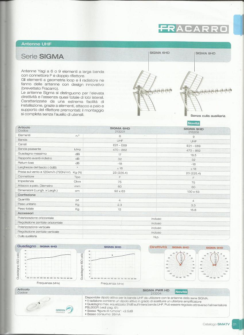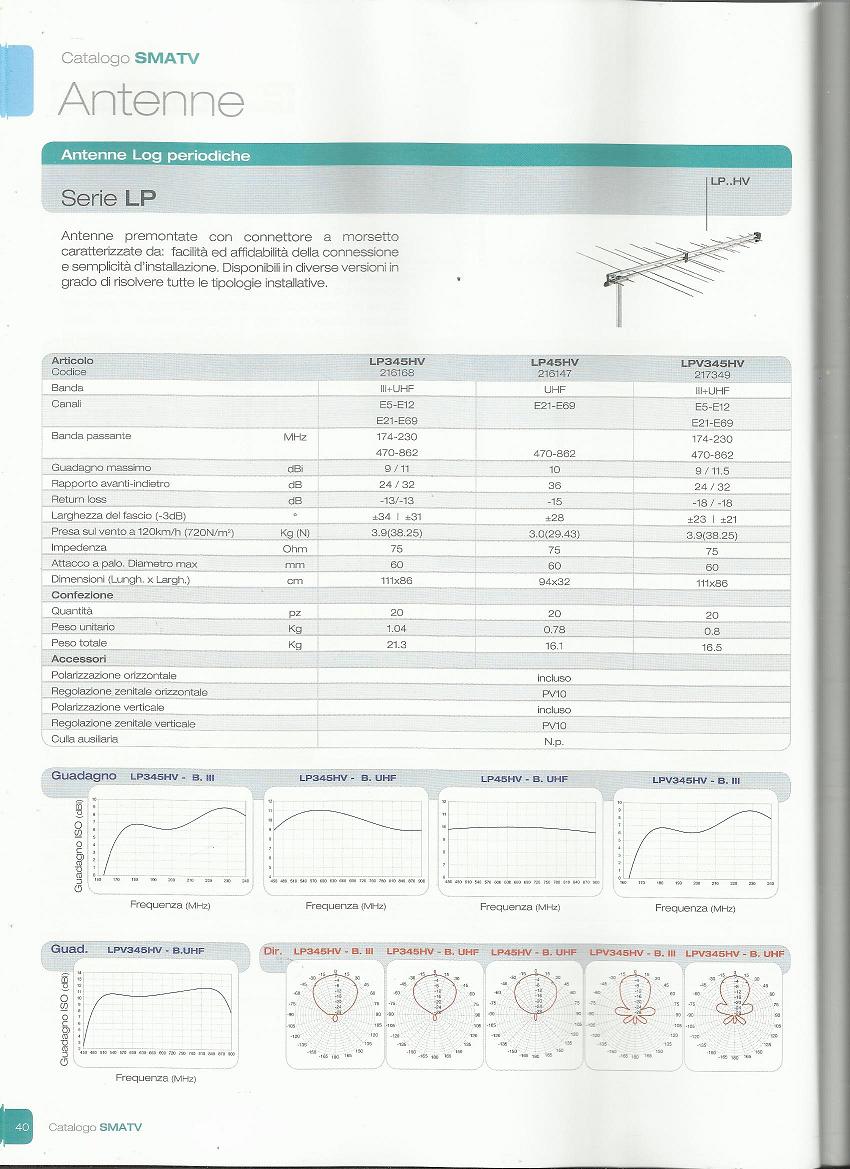 - antenna è l’elemento fondamentale di un impianto di ricezione in quanto, a seguito di un corretto puntamento, deve trasformare l’energia del campo elettromagnetico irradiato dalla postazione trasmittente in un segnale elettrico. L’elemento principale che consente questa trasformazione è il dipolo (ai capi del quale viene collegato il cavo coassiale che trasporta il segnale all’ingresso dell’eventuale centrale di testa o direttamente all’ingresso del decodificatore) viene realizzato in diverse forme e, combinato con elementi riflettori e direttori, completa l'antenna. Non esistono antenne specifiche per segnali analogici o digitali o antenne per trasmissione o ricezione, nella scelta occorre fare riferimento unicamente alle seguenti caratteristiche: frequenza di utilizzazione, guadagno, angolo di apertura o diagramma di irradiazione, rapporto avanti/indietro (rapporto tra sensibilità nella direzione di ricezione e in quella opposta), impedenza di ingresso (per le trasmissioni televisive è standardizzata a 75 Ω). Un tipo particolare di antenna è la log-periodica che ha la particolarità di avere una banda di frequenza di utilizzazione molto vasta, ad esempio VHF e UHF da 45 a 860 MHz, per contro presenta un basso guadagno e poca direttività queste caratteristiche la rendono utilizzabile solo per la ricezione nei bacini di utenza con buona intensità di campo e assenza di riflessioni e disturbi. In figura 6 sono riportate le caratteristiche tecniche e i diagrammi di irradiazione dei modelli di antenne log-periodiche estratti dal catalogo cartaceo Fracarro N°153, in figura 7 le caratteristiche tecniche dell’antenna 3-line estratte da catalogo cartaceo della ditta Emme esse, in figura 8 le caratteristiche tecniche dell’antenna Sigma estratte dal catalogo cartaceo Fracarro N° 153.