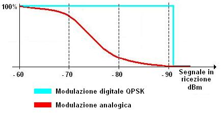 Il passaggio della trasmissione a microonde dei segnali analogici a quelli digitali comporta una serie innumerevole di vantaggi; in un ponte analogico a microonde se il segnale in ricezione scende sotto un certo livello, in genere -70dBm, il segnale audio e video subisce un progressivo peggioramento fino alla definitiva evanescenza delle immagini, in un ponte digitale a microonde invece la qualità del segnale trasmesso risulta di ottima qualità fino ad una soglia di circa 20 dB più bassa (in genere -90dBm) oltre la quale il segnale scompare completamente. In figura 2 è rappresentato l’andamento del segnale in ricezione di un ponte analogico e digitale mentre qui si possono trovare ulteriori informazioni relative alla realizzazione di collegamenti in ponte radio a microonde.