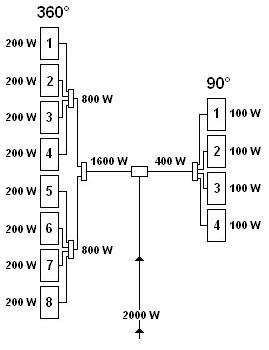 Il sistema radiante è l’elemento che permette la diffusione su un determinato bacino di utenza del segnale televisivo in uscita dalla catena amplificatrice su un canale della banda VHF o UHF, è costituito da una o più antenne elementari (per antenna elementare si intende un singolo elemento radiante caratterizzato da un preciso diagramma di ampiezza e di fase e da specifici valori di guadagno) che opportunamente posizionate e collegate su un unico sostegno, permettono la composizione di sistemi radianti più o meno complessi con differenti caratteristiche di irradiazione. Ogni antenna elementare occupa una precisa posizione geometrica e azimutale ed è alimentata da una percentuale della potenza fornita dall’amplificatore finale; insieme a tutte le altre antenne elementari del sistema contribuisce alla generazione del solido di irradiazione che è l’elemento caratteristico del sistema radiante, esso avrà la forma voluta dal progettista in base alle esigenze di copertura radioelettrica sul territorio, in figura 3 è rappresentato un esempio di divisione di potenza per ottenere un solido di irradiazione per la copertura di una determinata area di servizio. Un sistema radiante può essere composto: