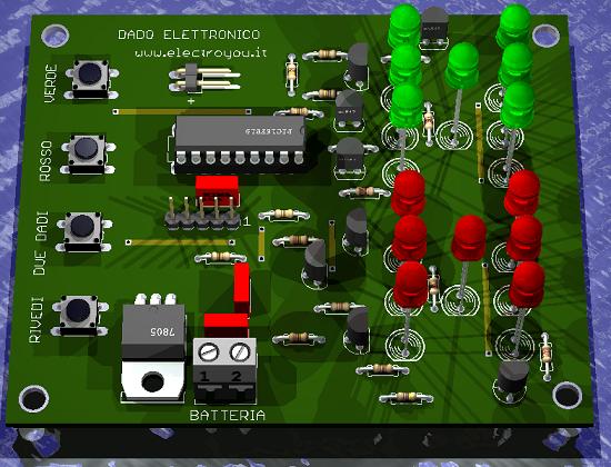 - il circuito deve prevedere due dadi a LED con colori differenti, uno rosso e uno verde;