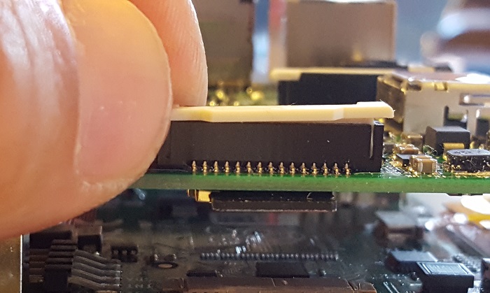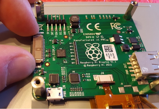 Il connettore da impiegarsi su scheda video è quello accanto alla scritta RPI-DISPLAY. Il connettore va aperto tirando entrambi i lembi della parte mobile (di colore nero) del connettore. Una volta stratta la parte mobile, il flat va inserito e spinto fino a battuta meccanica e mantenuto parallelo; quando è posto in posizione, si può procedere a serrare nuovamente il connettore.