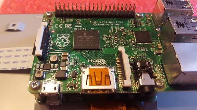 Per minimizzare gli ingombri, Raspberry PI 2 può essere alloggiata proprio sotto alla scheda video, ottimizzando coì anche la connessione video. Una volta posizionata e fissata Raspberry PI 2 sui distanziali e aver bloccato il tutto con le quattro viti in dotazione, si passa al collegamento del flat su RPI.