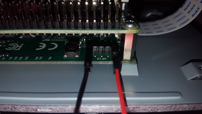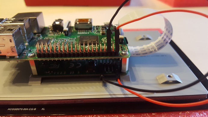 Il display va ora alimentato. Come anticipato, l'alimentazione potrebbe essere fornita direttamente al suo connettore PWR-IN e, con una patch USB, dalla scheda di interfaccia alimentare poi RPI. In alternativa è possibile sfruttare i pin di alimentazione come indicato nel seguito. Sulla scheda di interfaccia, i contatti alle estremità della pin-strip denominata GPIO, sono contatti di alimentazione (come nella foto, GND a sinistra e +5V a destra).