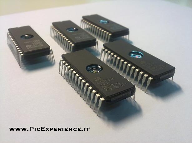 In questa immagine alcune EPROM, memorie che venogono programmate per via elettrica e cancellate con raggi U.V.
